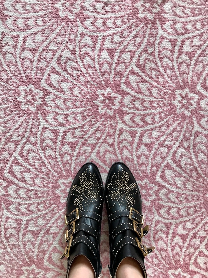 Emily’s cool boots on her new Liberty Fabrics Capello Shell Coral bedroom carpet