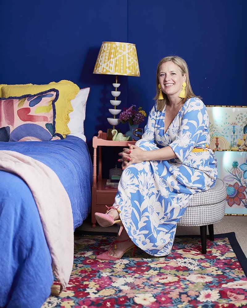 Sophie Robinson, Interior Designer and TV Interiors Expert, with her perfect Quirky B Liberty Fabrics Flowers of Thorpe Summer Garden rug with single cotton border. Image © Alun Callender