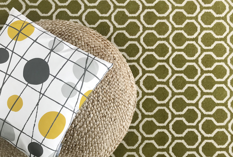 Quirky B Honeycomb Moss rug designed by Mini Moderns with Alternative Flooring’s Make Me A Rug.Pavilion Cushion by Mini Moderns.