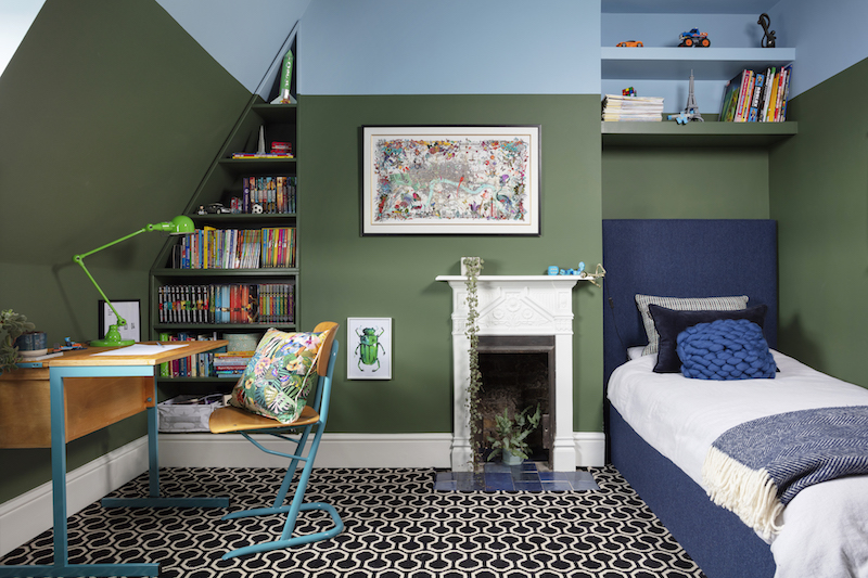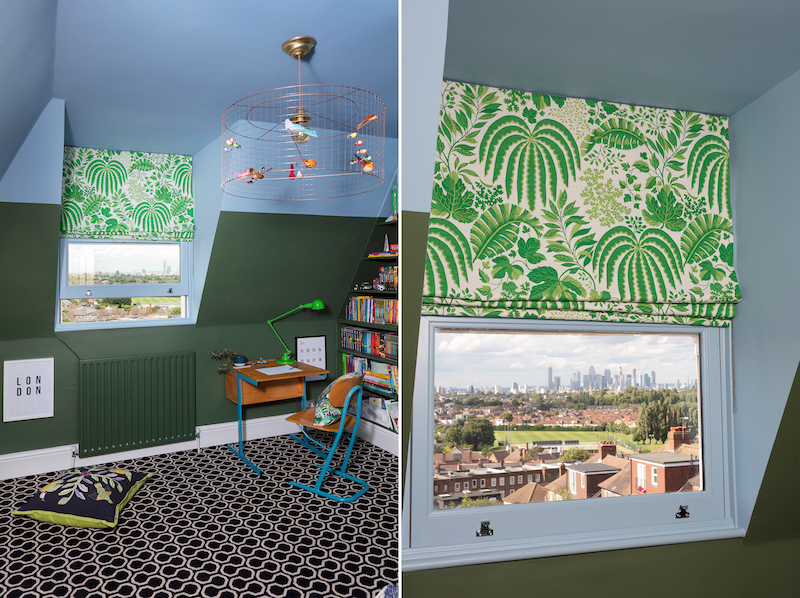 Unlike the Pink House Husband, Oscar does take an interest in the design of his room beyond vetoing my design suggestions! He was the one who suggested green and gold as the starting colours for the room’s design and was delighted with my idea that we used his room to bring an element of nature into the space to complement the urban view from his window.