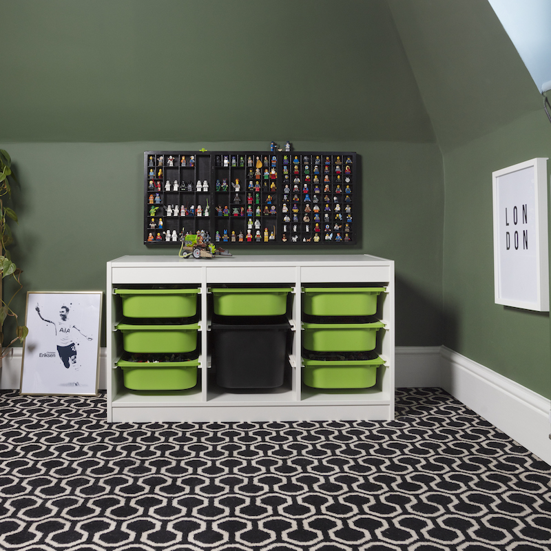 Oscar’s LEGO station in his bedroom. Alternative’s Quirky B Honeycomb in Black carpet. Image by © Susie Lowe Studio