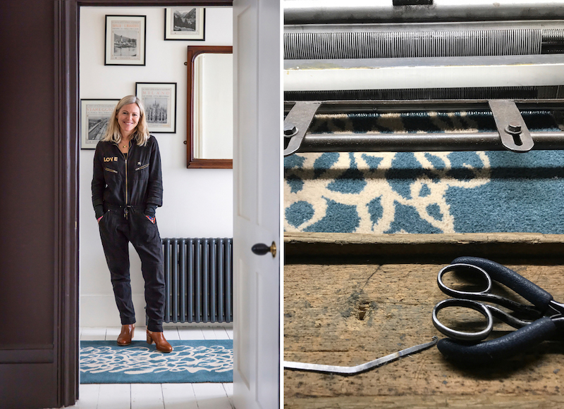 Image on the left: Ella Doran with the Waterlake wool runner, Courtesy the artist and Alternative Flooring. Photo ©Ben Robertson. Image on the right: Alternative Flooring weaving Waterlake wool runner, Courtesy the artist and YSP. Photo ©Paul Wyatt