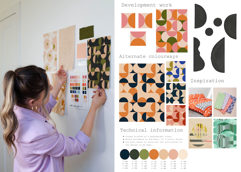 My entry was inspired by my desire to bring joy to the interior setting through playful and bold design. My inspiration comes from patterns that occur in the manmade world, looking to Modernist architecture specifically for this design. Crafted pattern represents what’s at the core of my practice; pattern, process and colour. Pattern is part and parcel of our everyday life – from the ornate to the mundane – it is my passion. This entry seeks to share and celebrate it. The concept behind this design was to invite consumers to embrace colour and pattern in their home setting.
