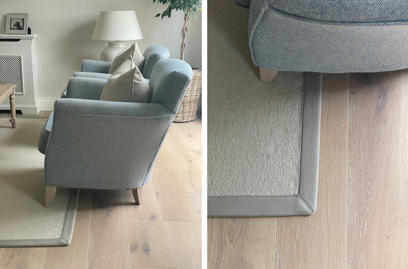 We have an Alternative Flooring rug in the living area of our open plan area in the kitchen. It works so well at zoning this space as well as being cosy underfoot. The scheme of this room has relaxed coastal vibes with blues, beiges, white ceramics and lime washed oak furniture.