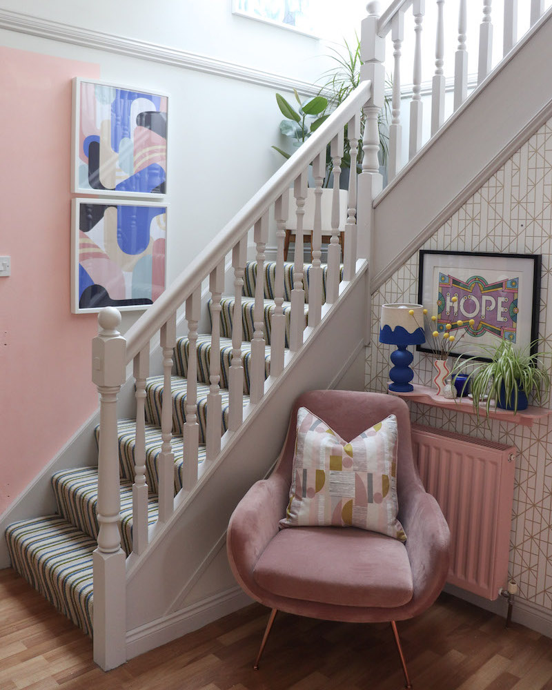 My signature design style is using neutrals with pops of bold colours. I wanted to create this feel in the hall as well. I deliberately kept our walls neutral with bold accent colours coming from pieces of upcycled furniture art and accessories. I chose a stripe for the stairs as the real show stopper. Each of the stripe colours is a colour from my home colour palette, so when you walk into my hall, the striped carpet is almost like an introduction of the colour scheme you will expect to see in the rest of the house.