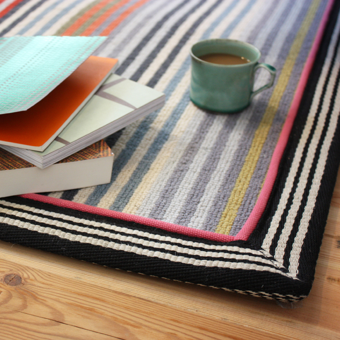 Award winning textile designer Margo Selby’s Rug Stars choice is her own design Frolic Westbrook, a multi-coloured striped rug, that she has teamed with an inner Double Piping Cotton Border in Pink and an outer Stripes Thick Black border.